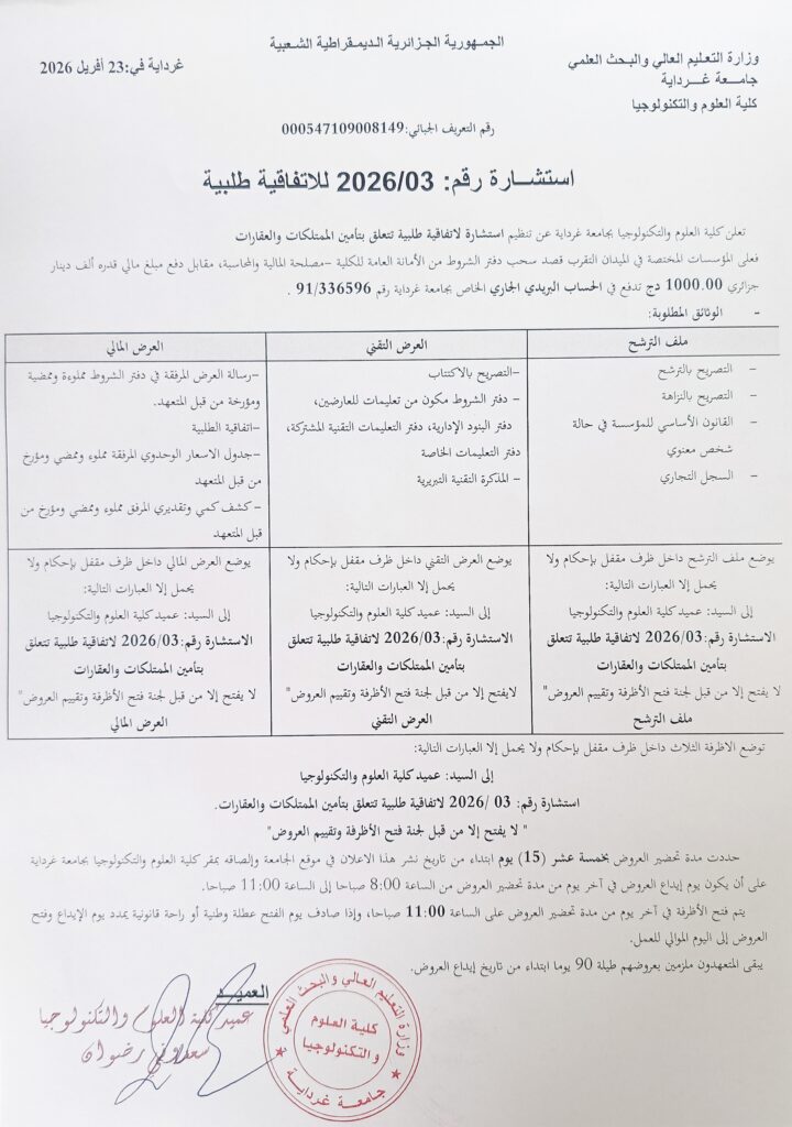 إعلان عن الاستشارة رقم 2026/03 23 أبريل 2026 الاستشارات 13 زيارة Oplus_16908288 شاركها Facebook Twitter LinkedIn